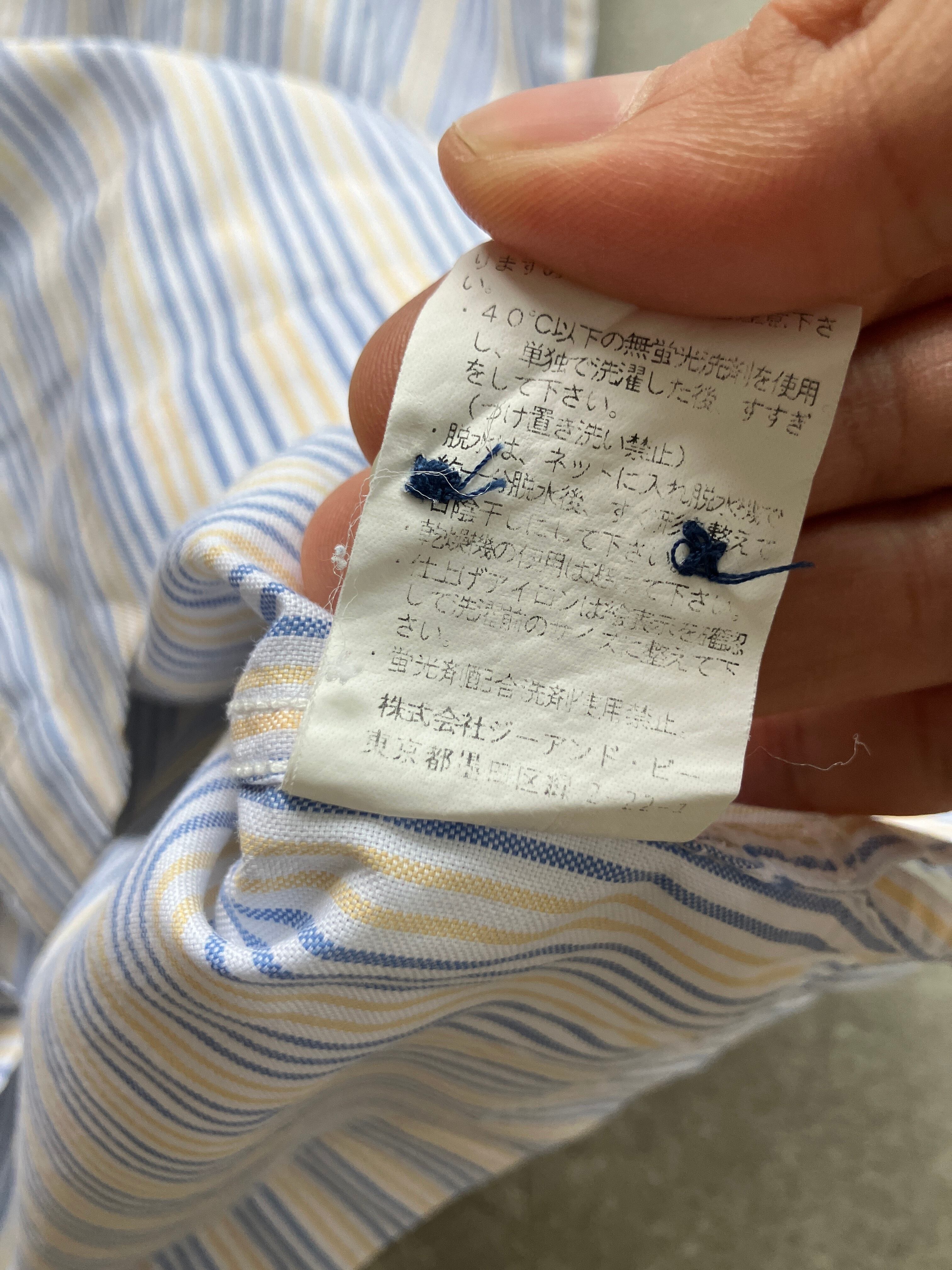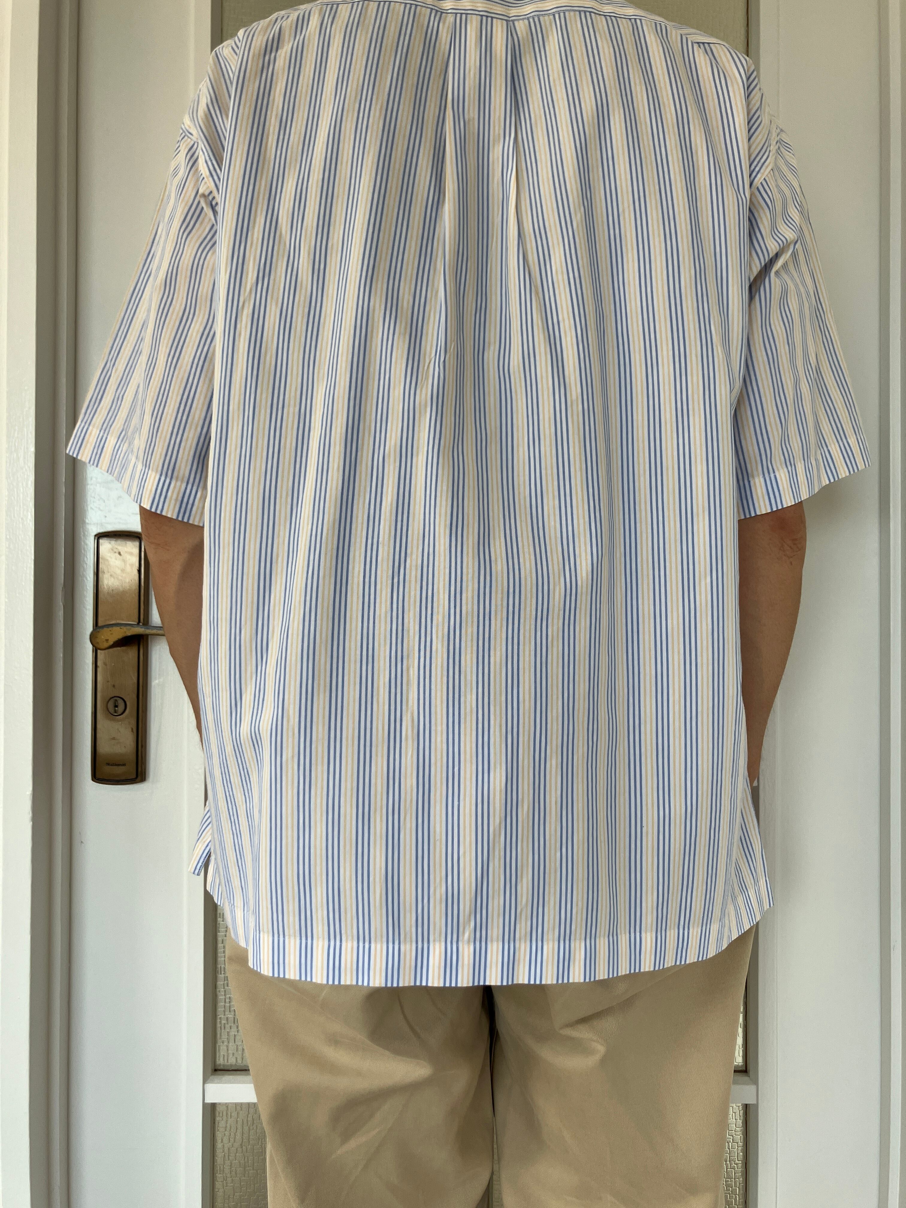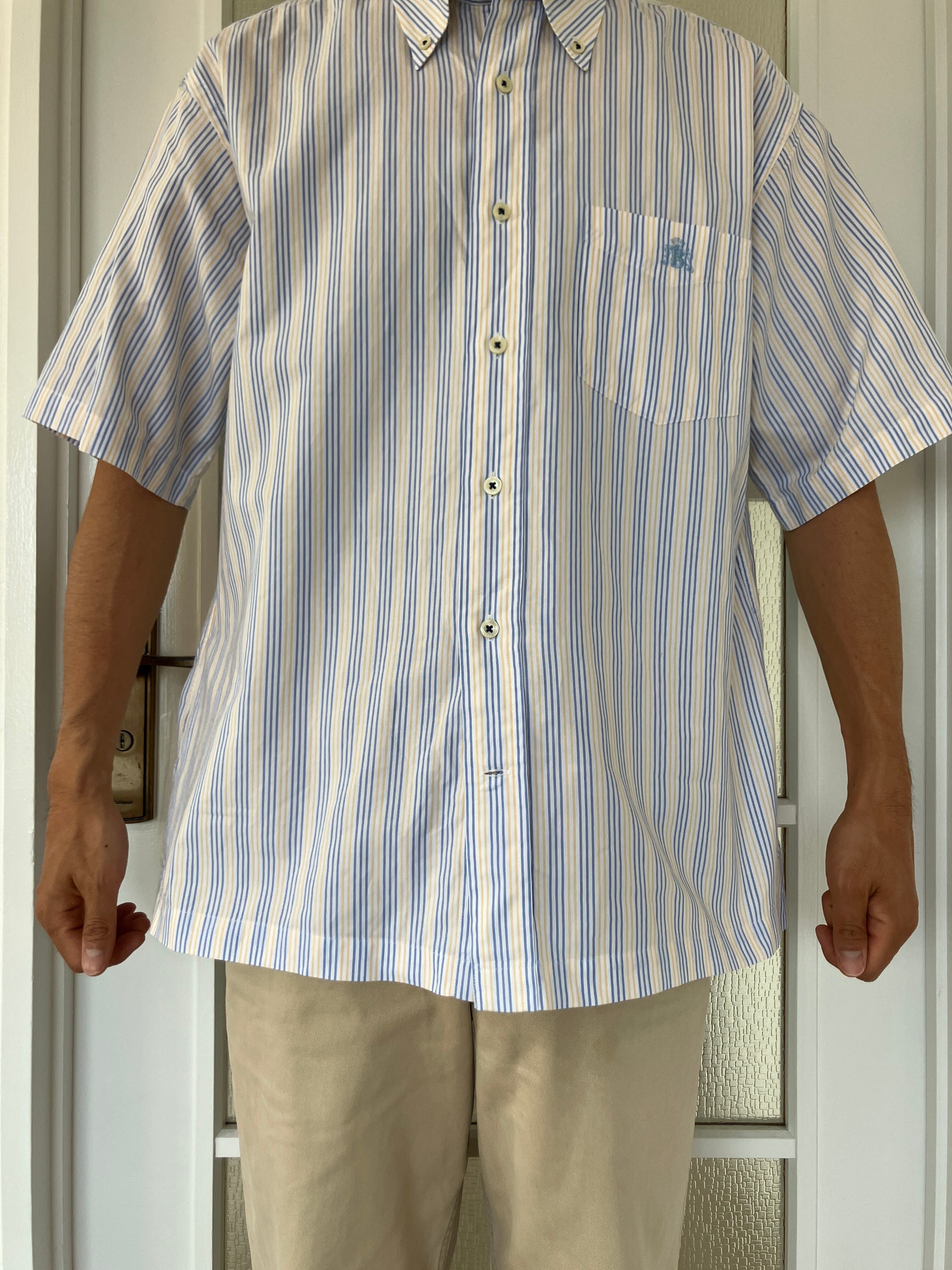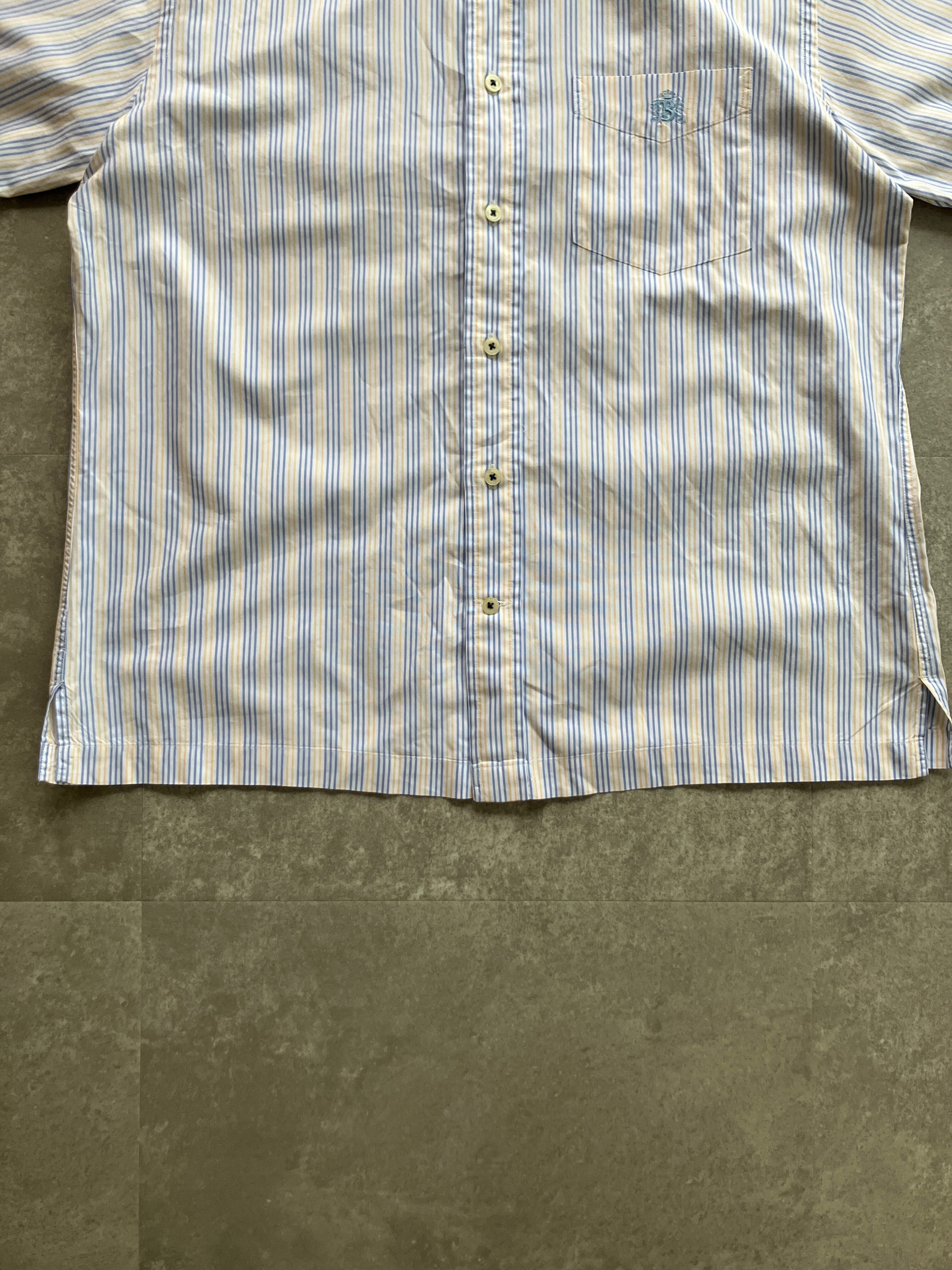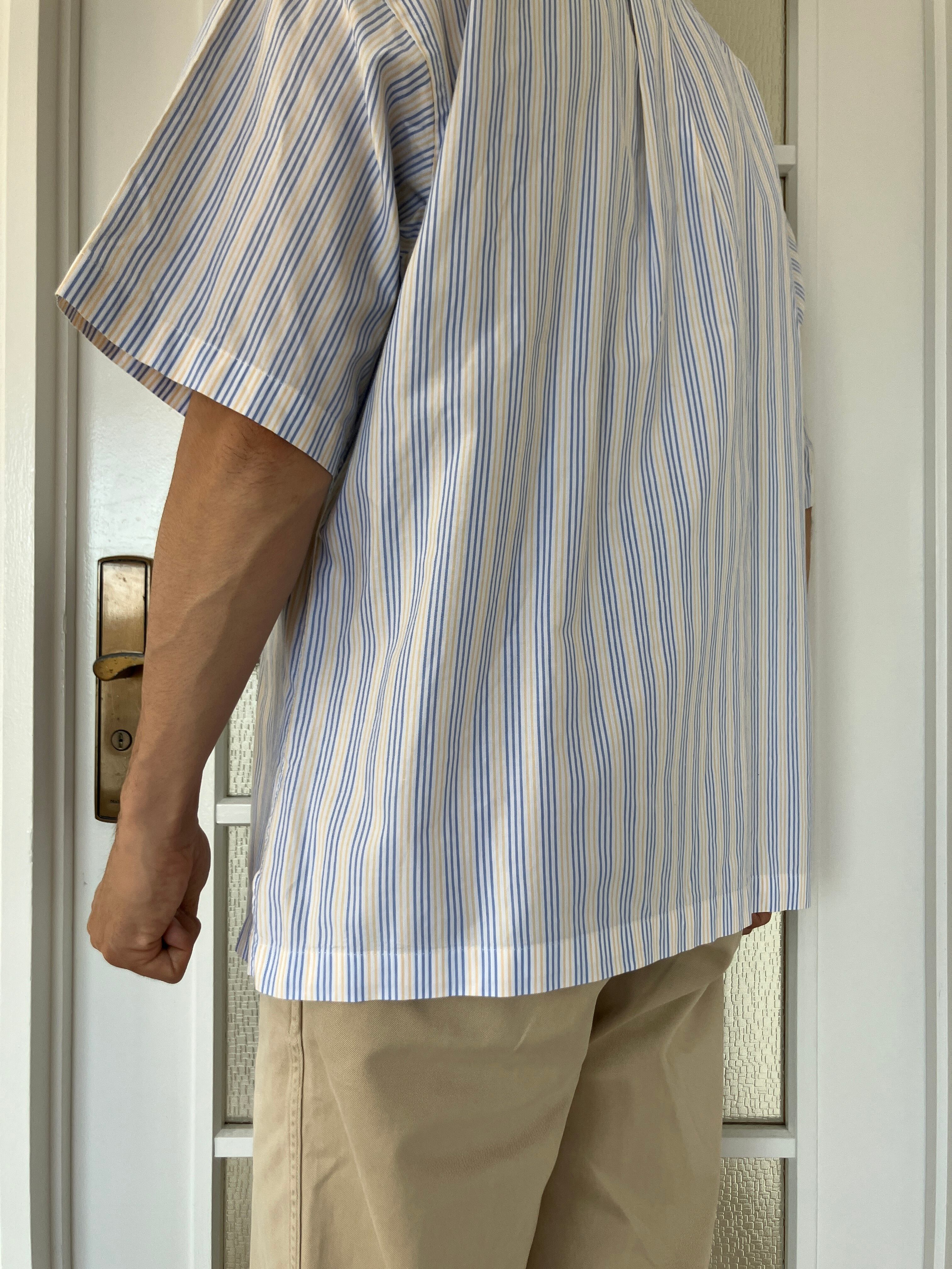 水色と薄黄色のストライプが非常に爽やかな印象且つ、当店大好物のボックスシャツということで迷わずチョイス