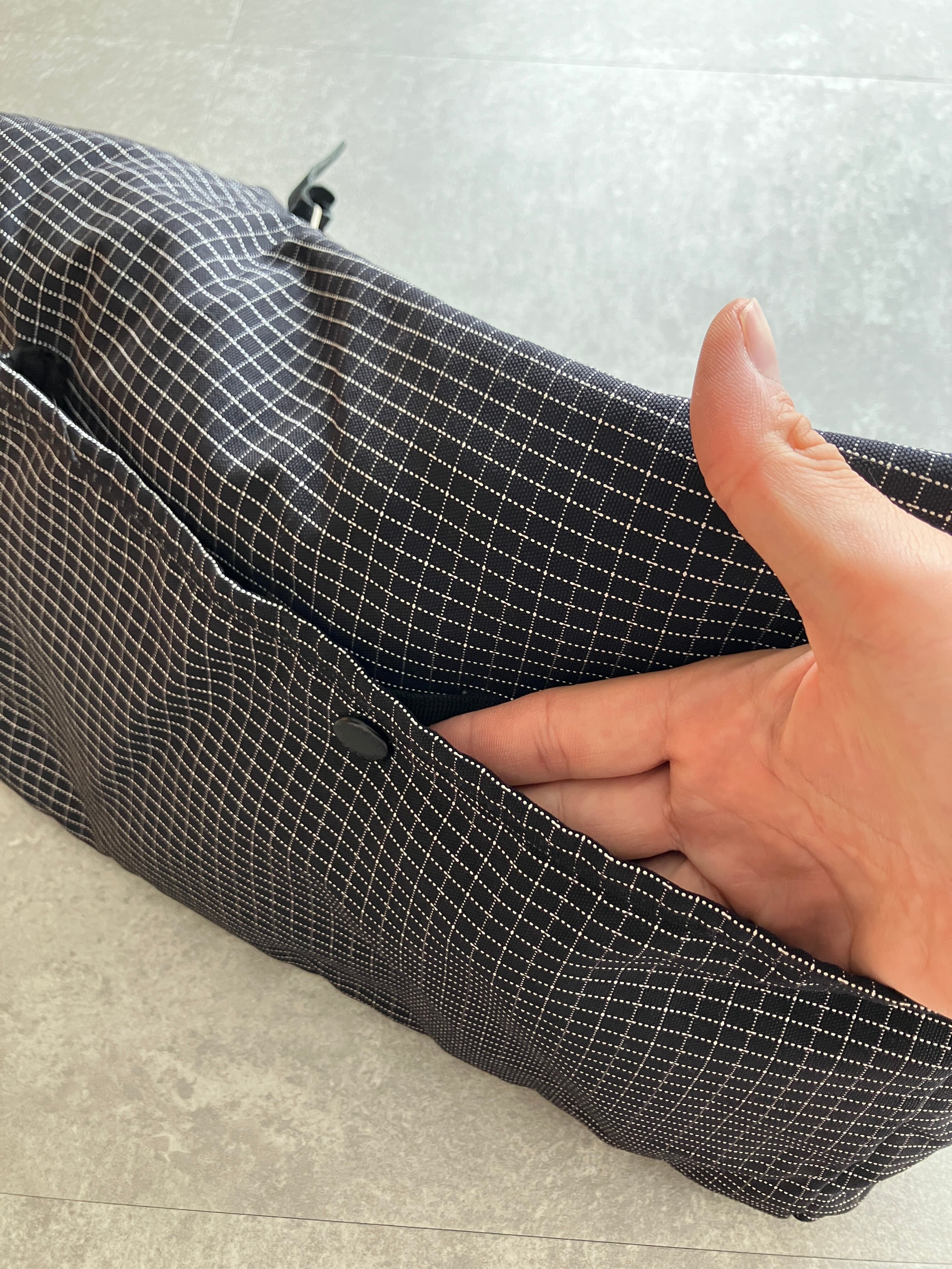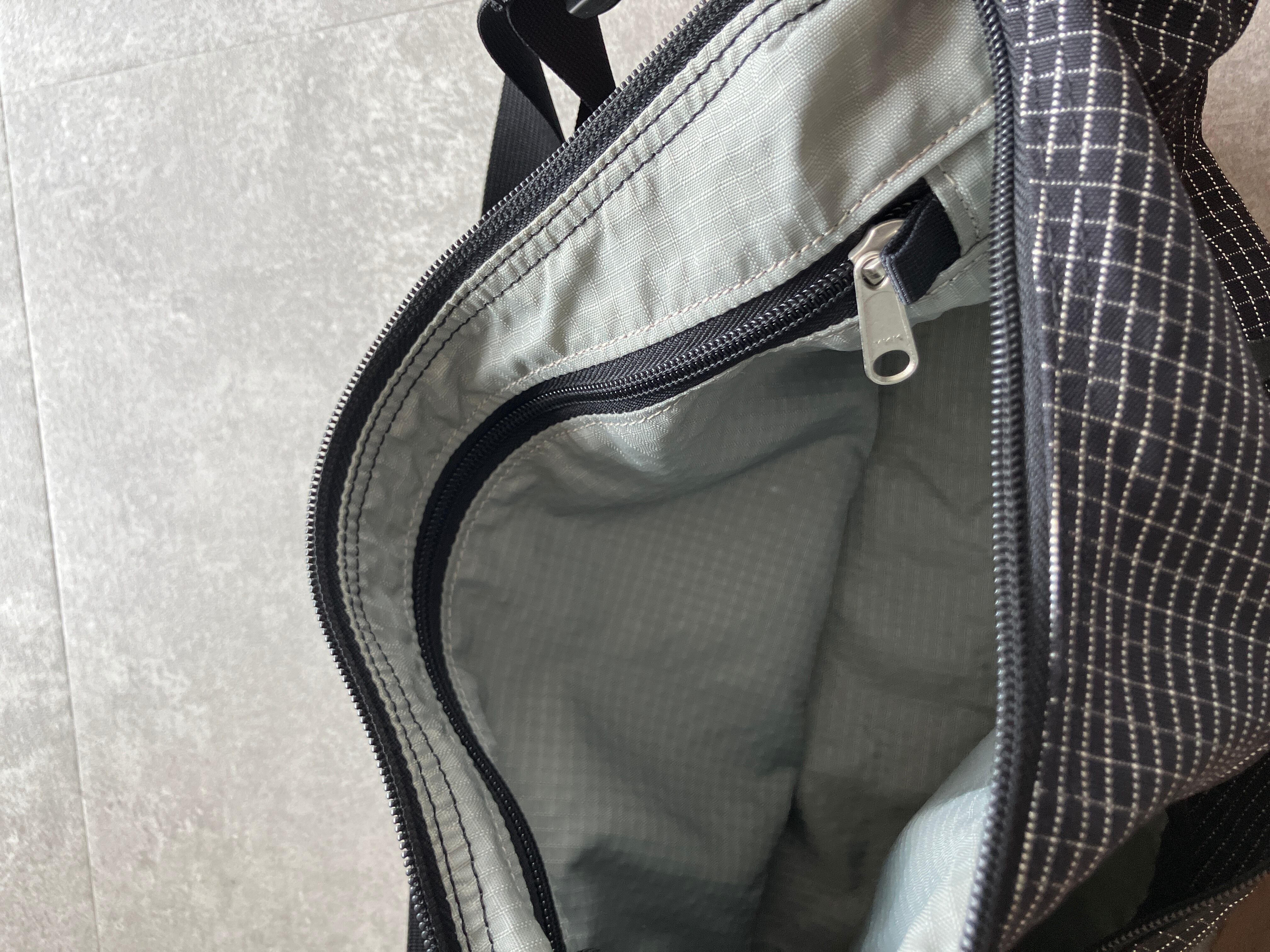 底には補強テープ、背面にスナップ付きオープンポケット、フロントにジッパー式アクセサリーポケット、内部に小さくバラツキがちなアイテムの収納に便利なポケットなど、日常に使い勝手の良い設計となっています