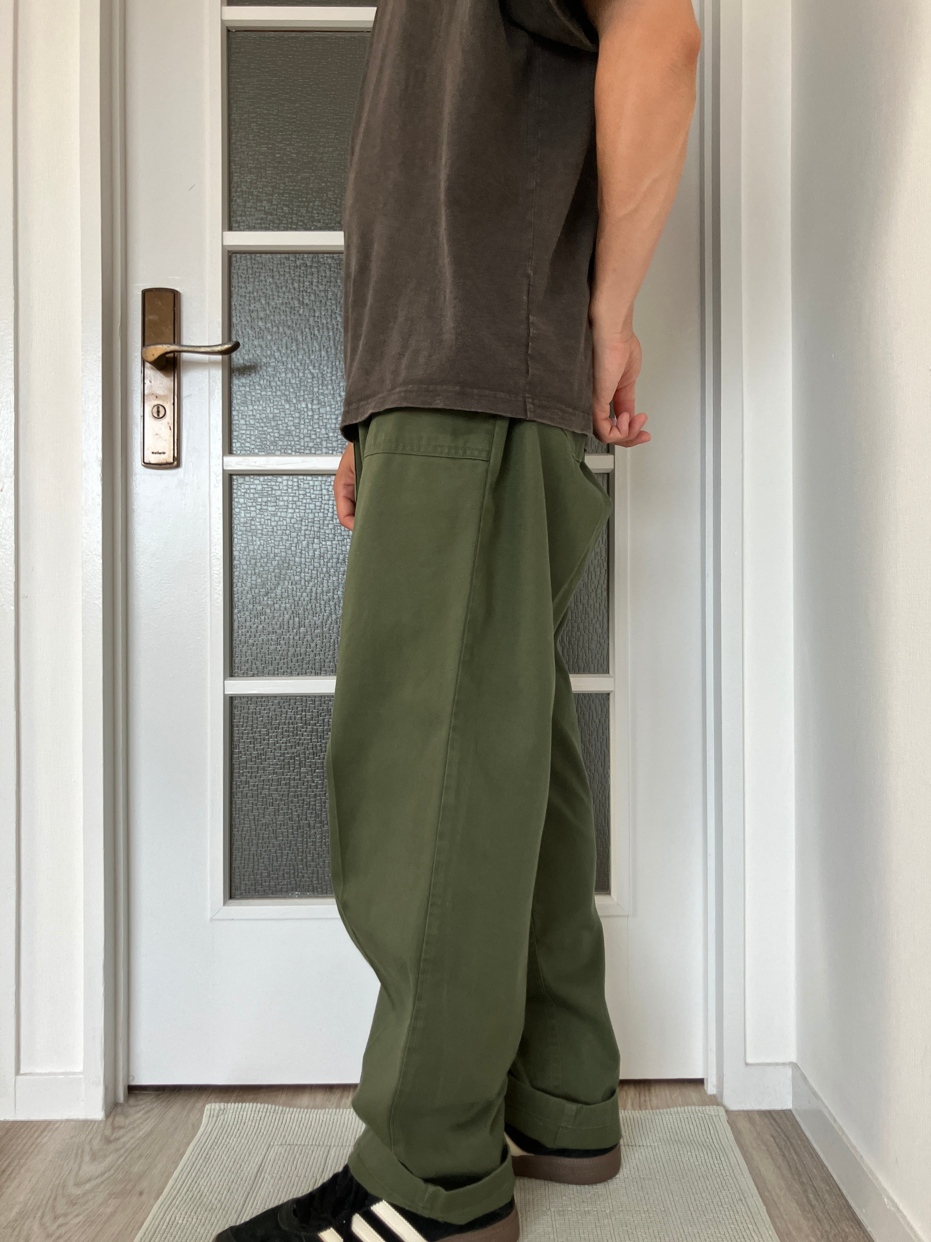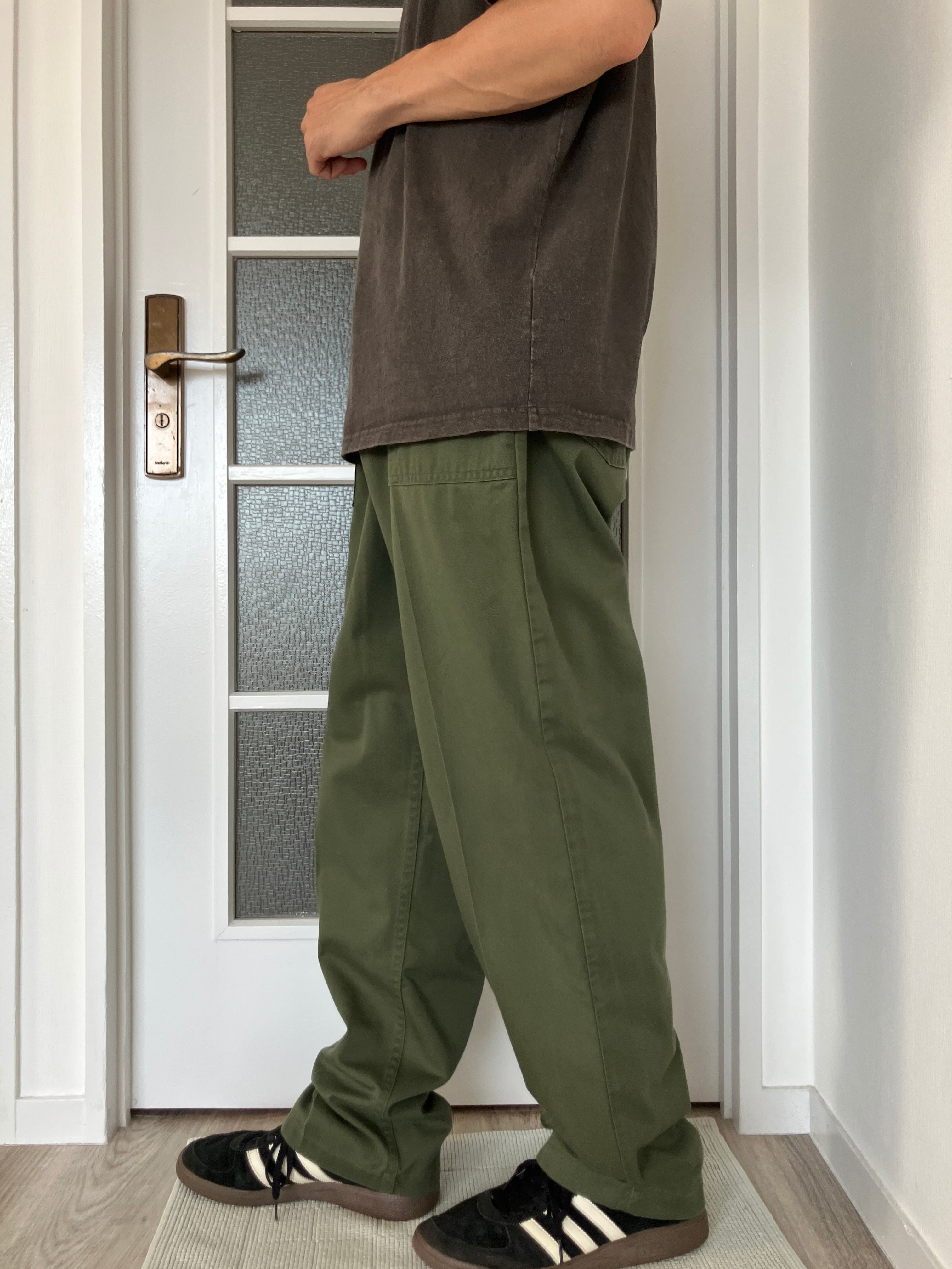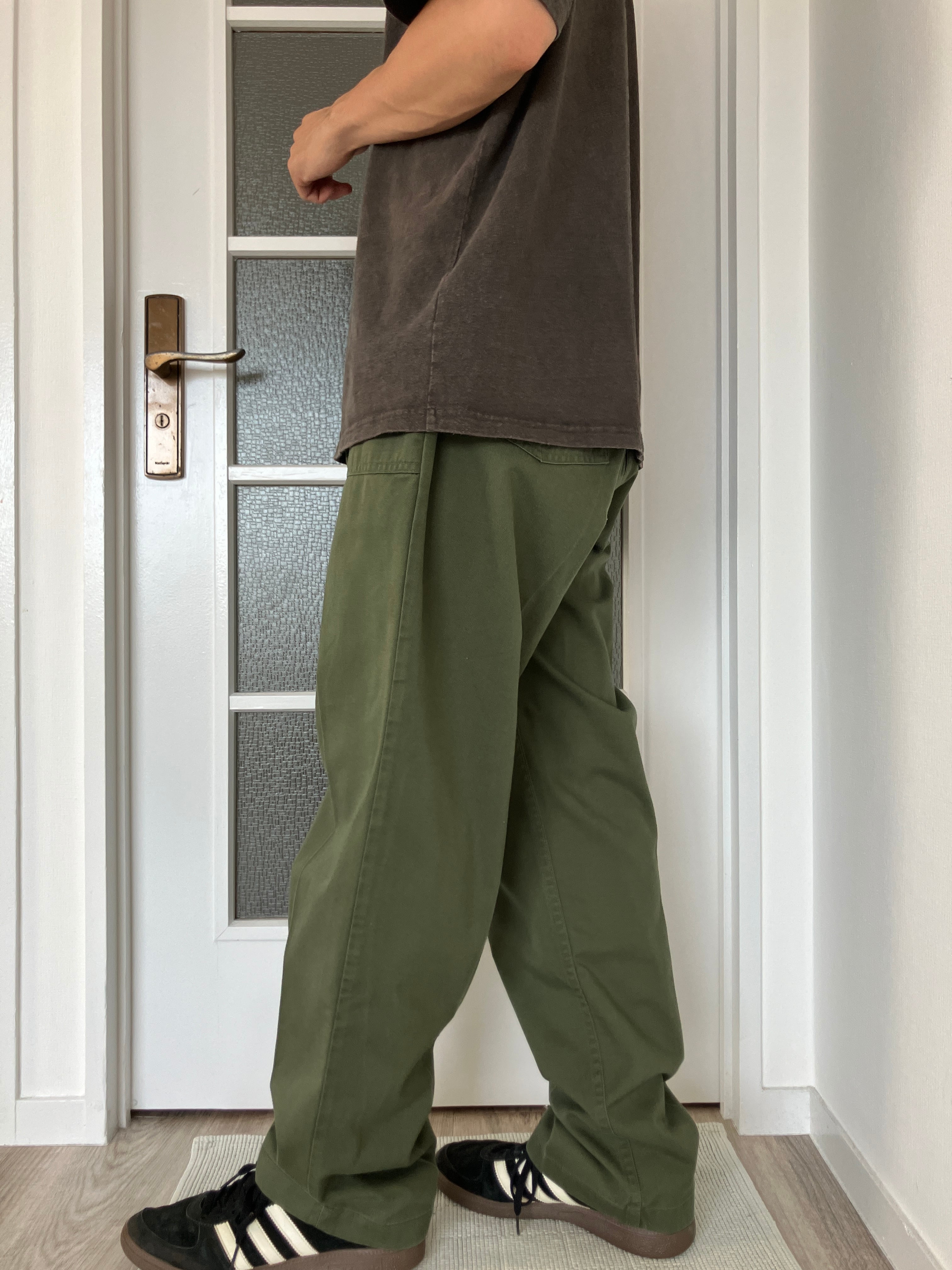 腰周りには適度にゆとりがありますが、試着してみるとミリタリーには珍しいテーパードシルエットで非常に綺麗なシルエットが出てくれました