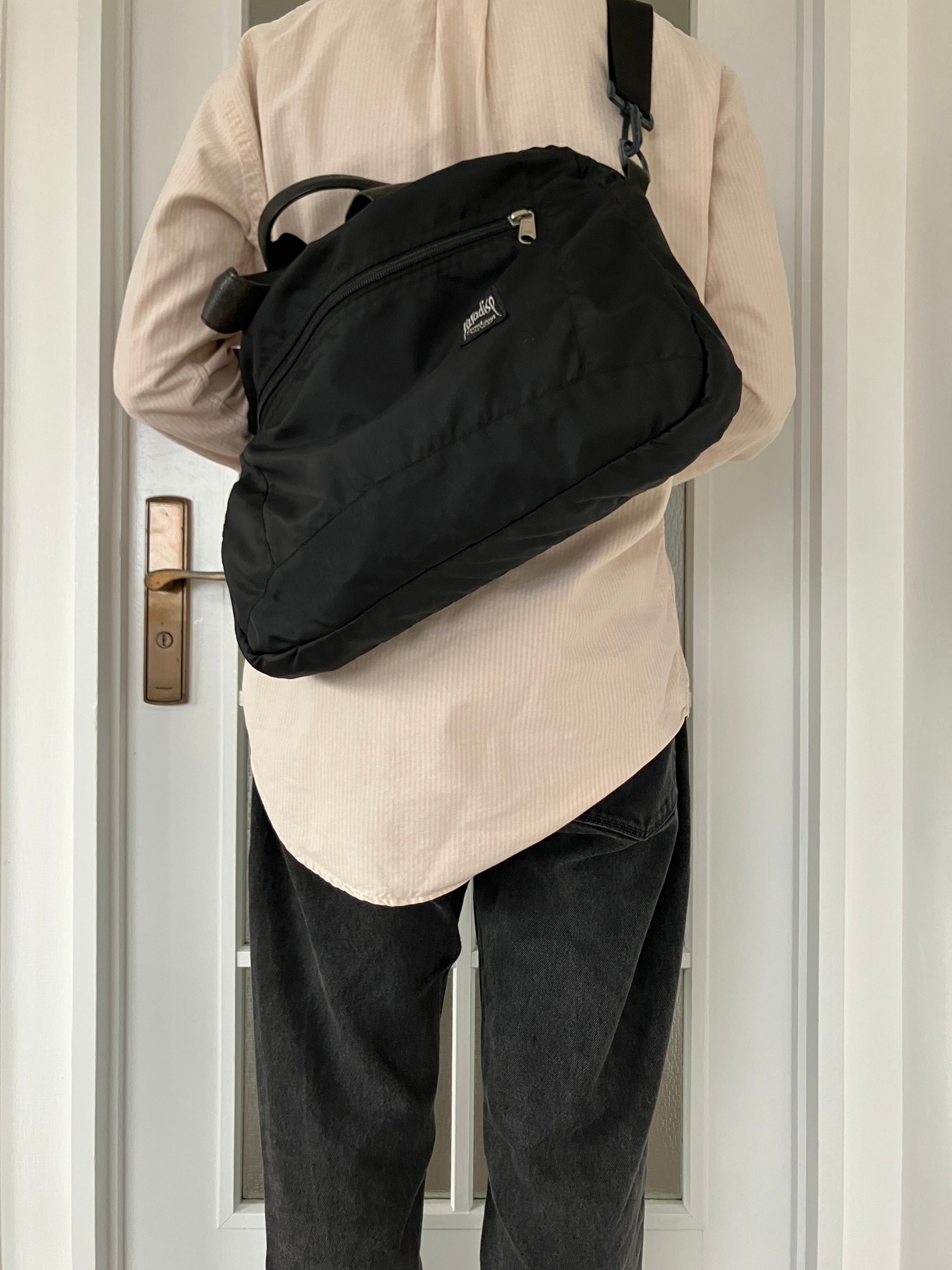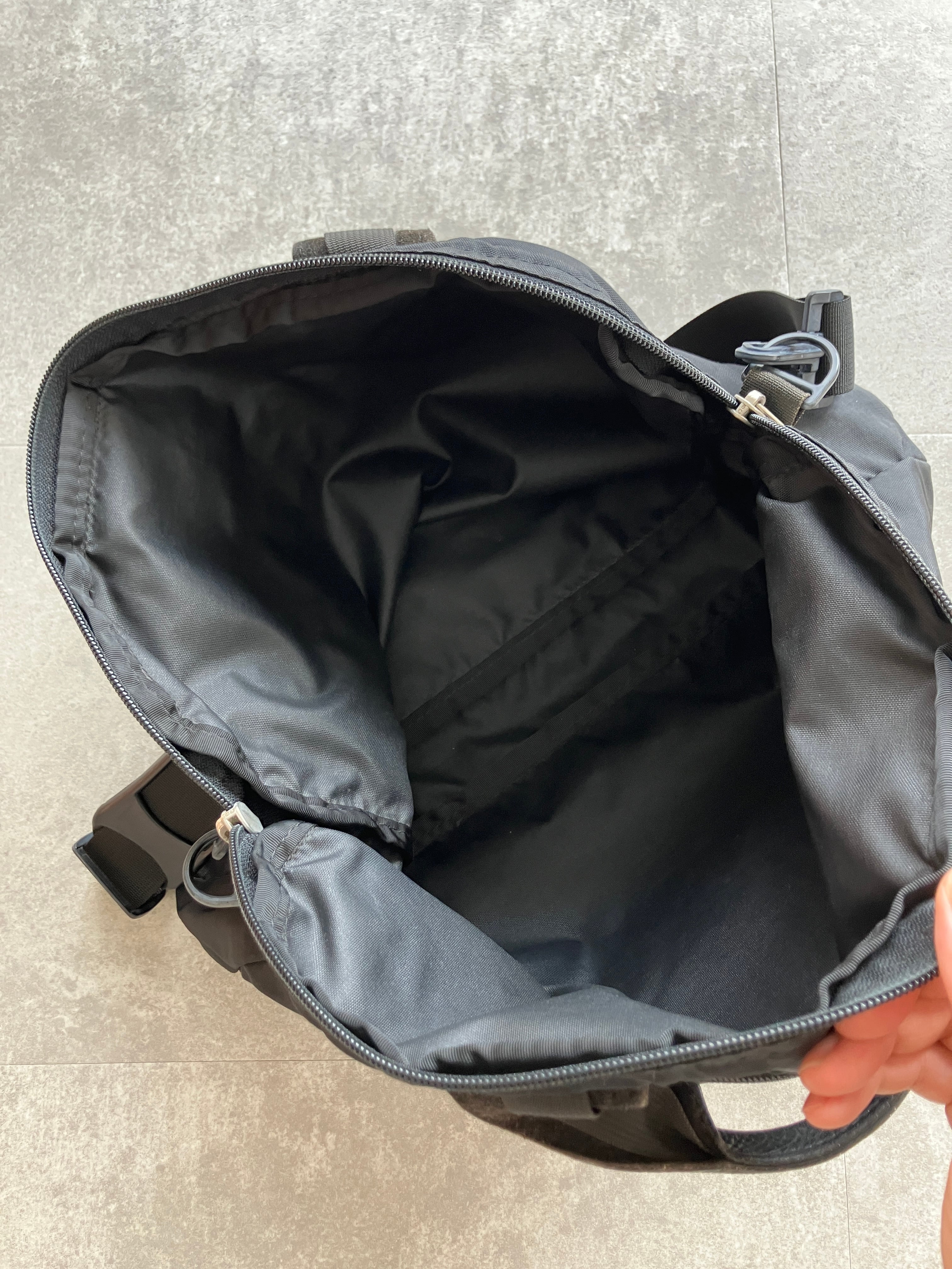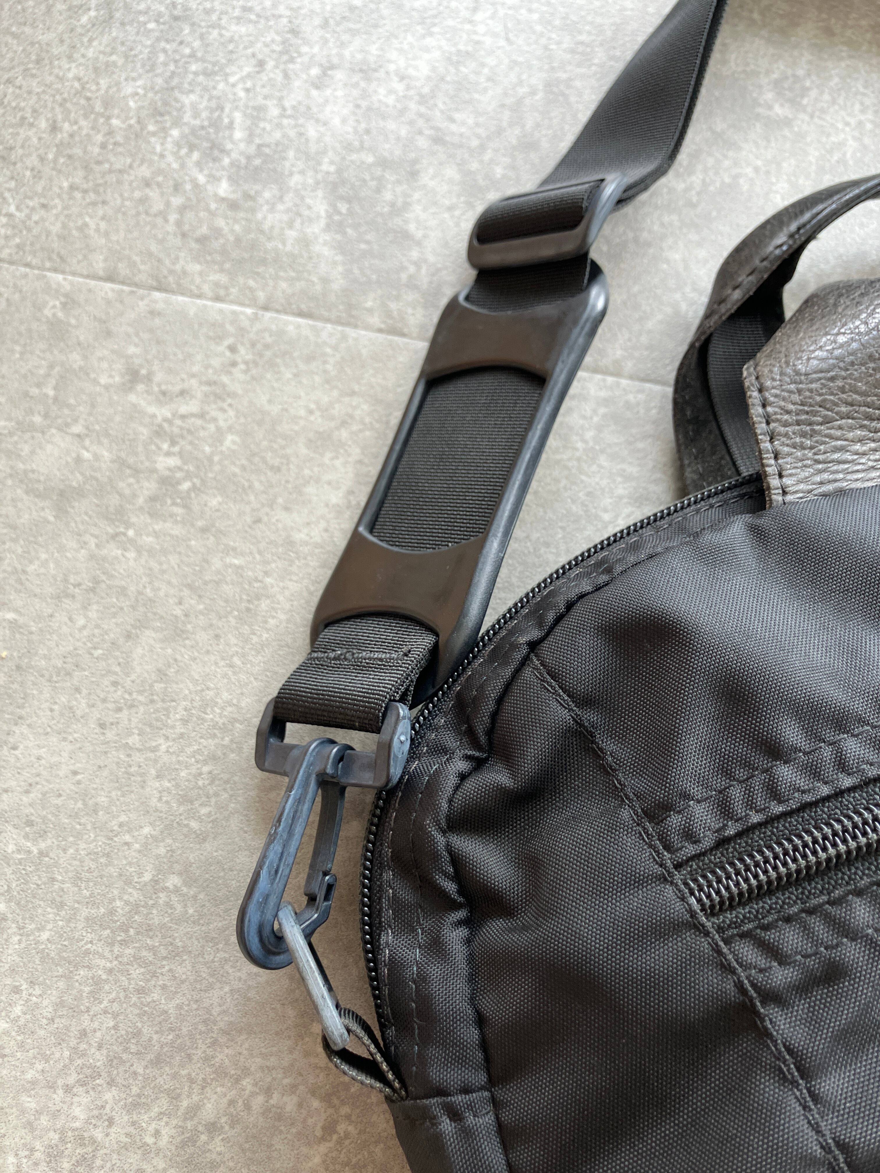 シンプルな構造ながら取っ手はレザーが使われており、プロダクトとしてのこだわりを感じます、斜め掛けしたときのシルエットも悪くない
