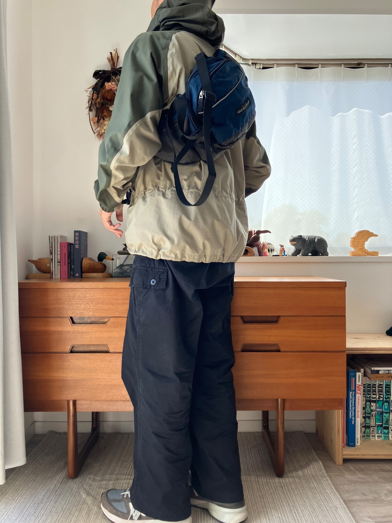 現行とは質感がことあり、ややマッドなブルーにリップストップナイロンが用いられていて、見た目的には、ガシっとした雰囲気が現行モデルとの違いになります