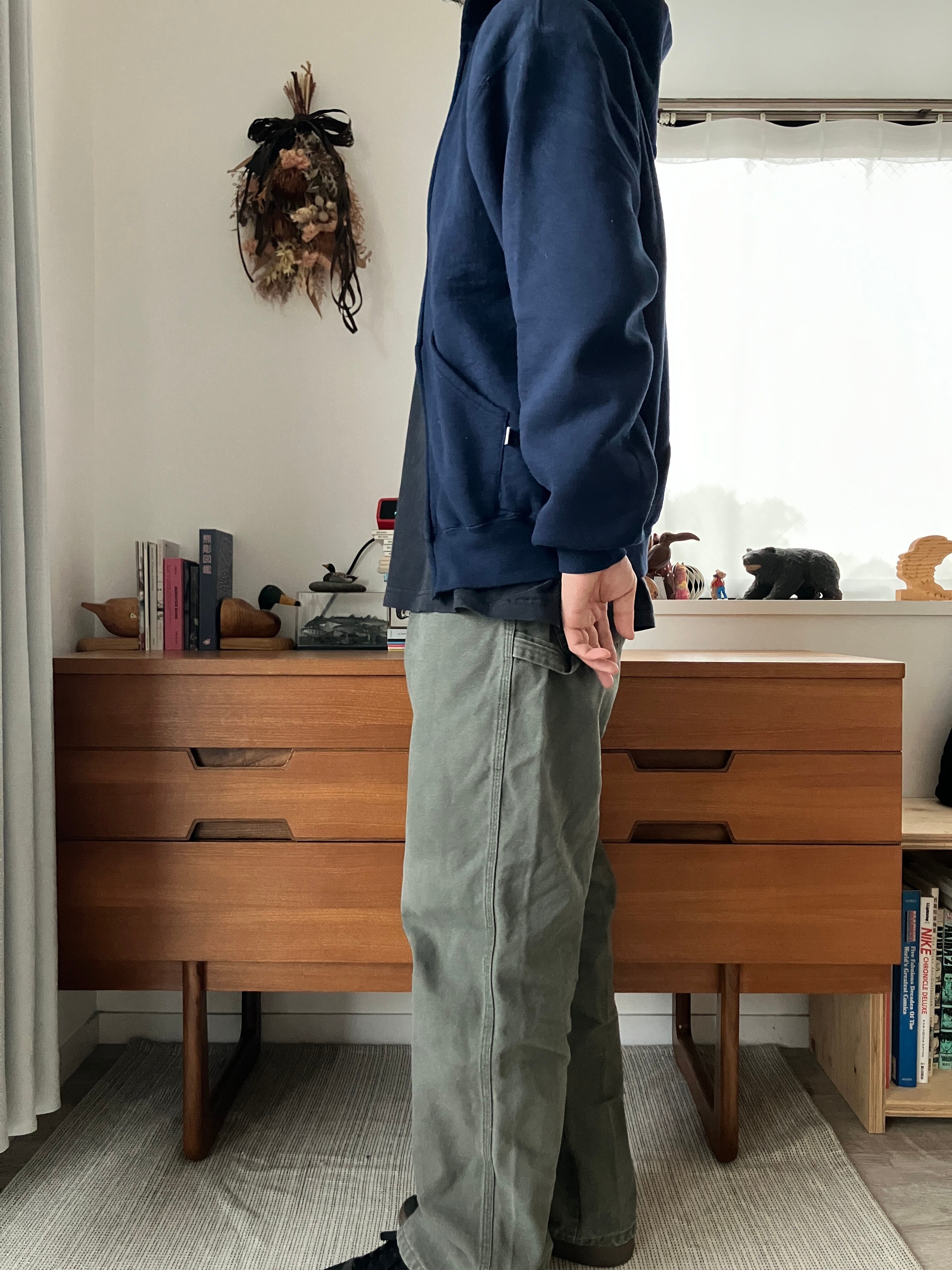 太いアーム幅、身幅はたっぷりで丸っこいシルエットはそのままに、丈が短い