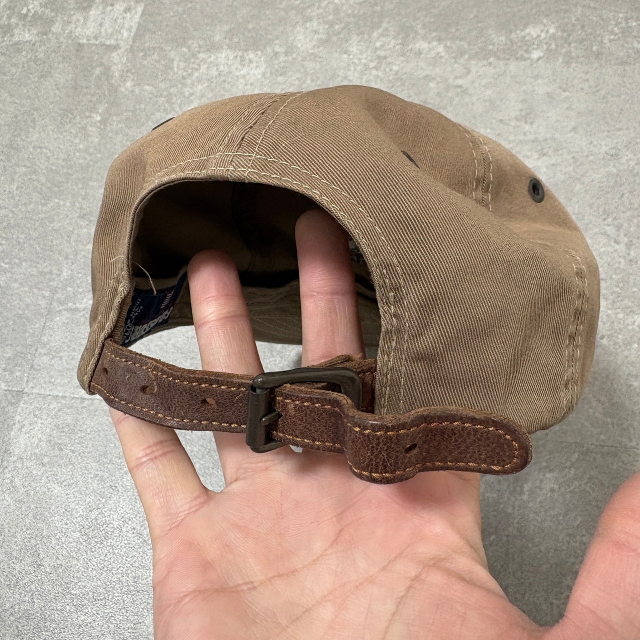 アジャスターベルトはレザー、刺繍のブランドロゴは同色系なので目立ちにくく、