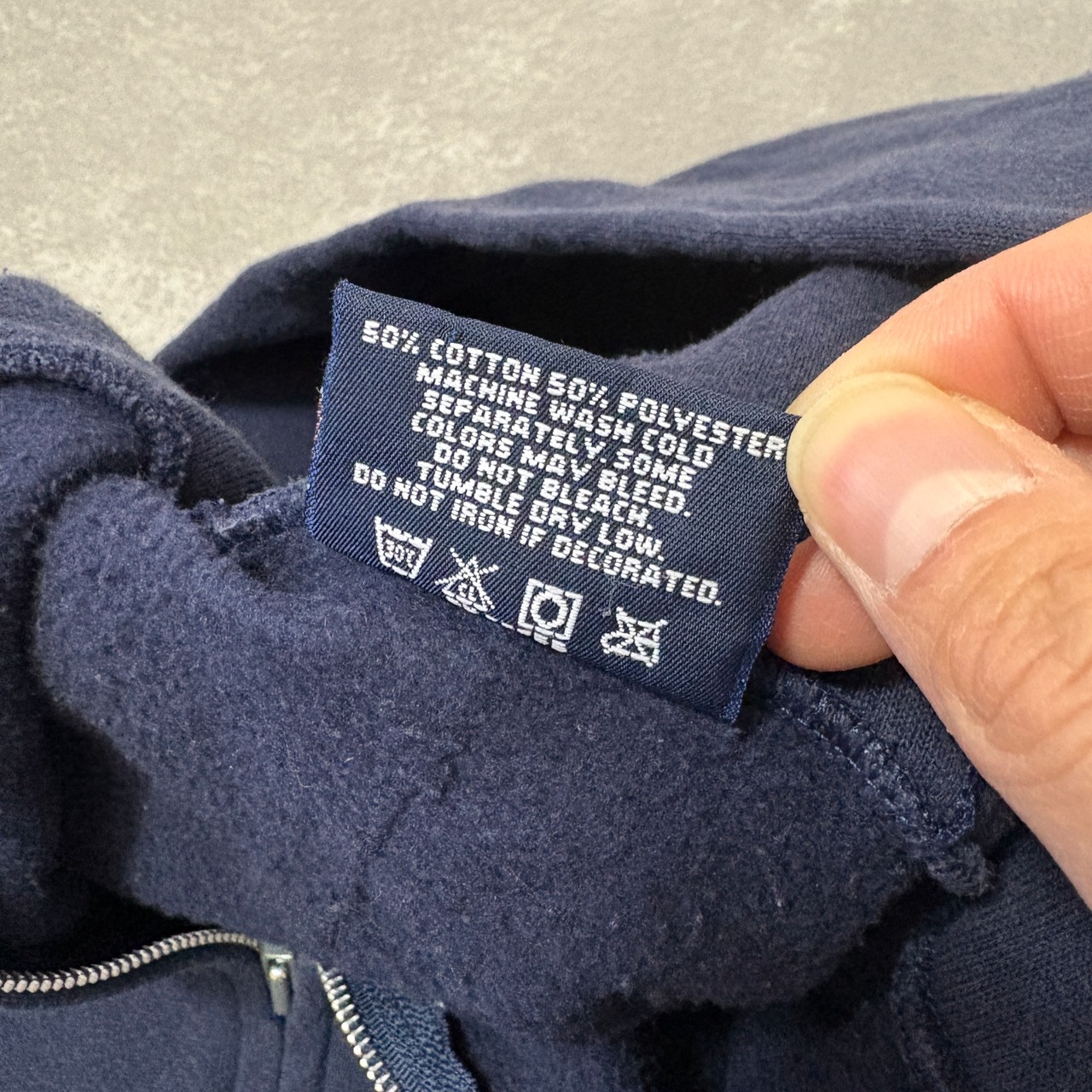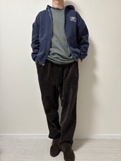 フェードはしているものの色残りもあるネイビー、うねうねしたジップ、程よいヤレ感、