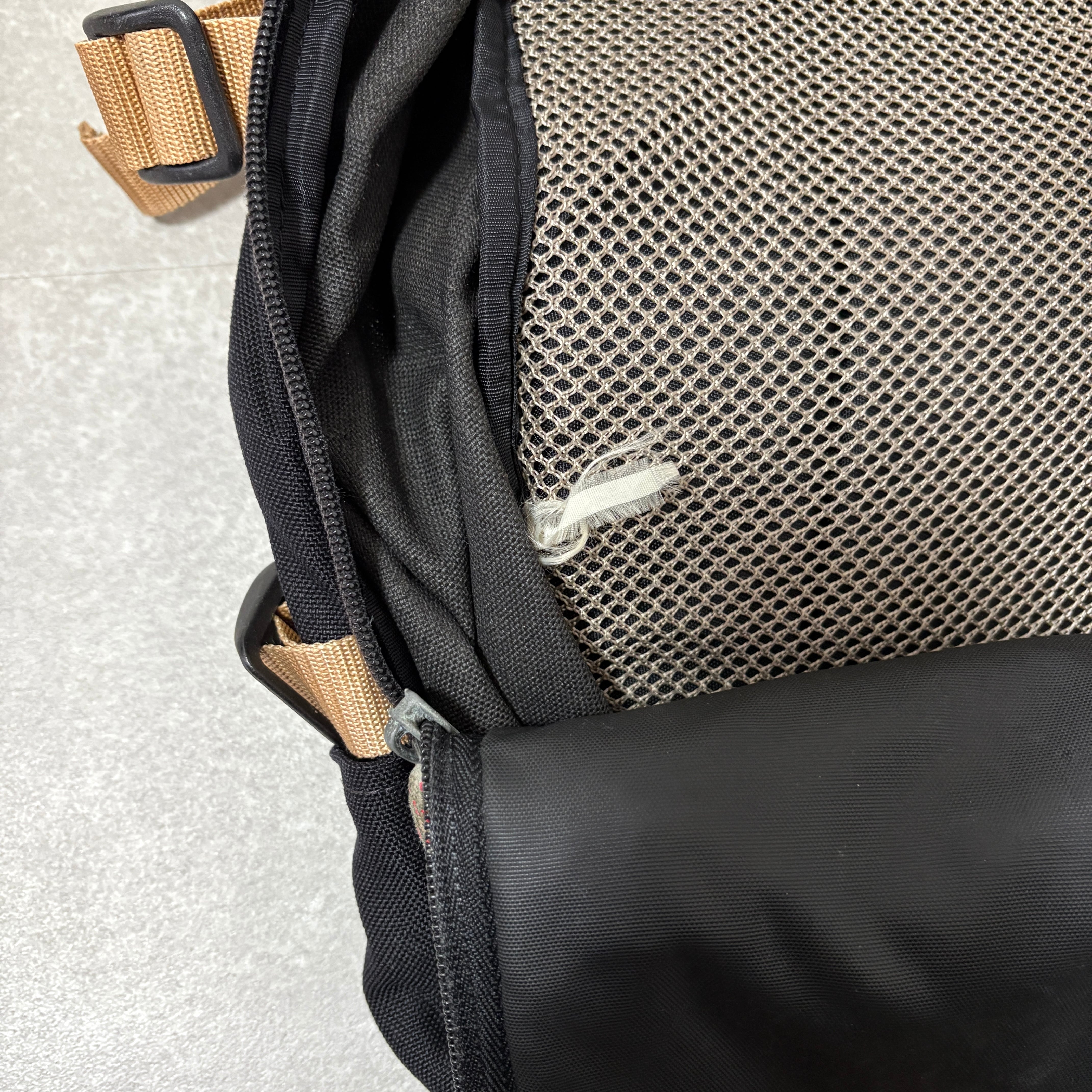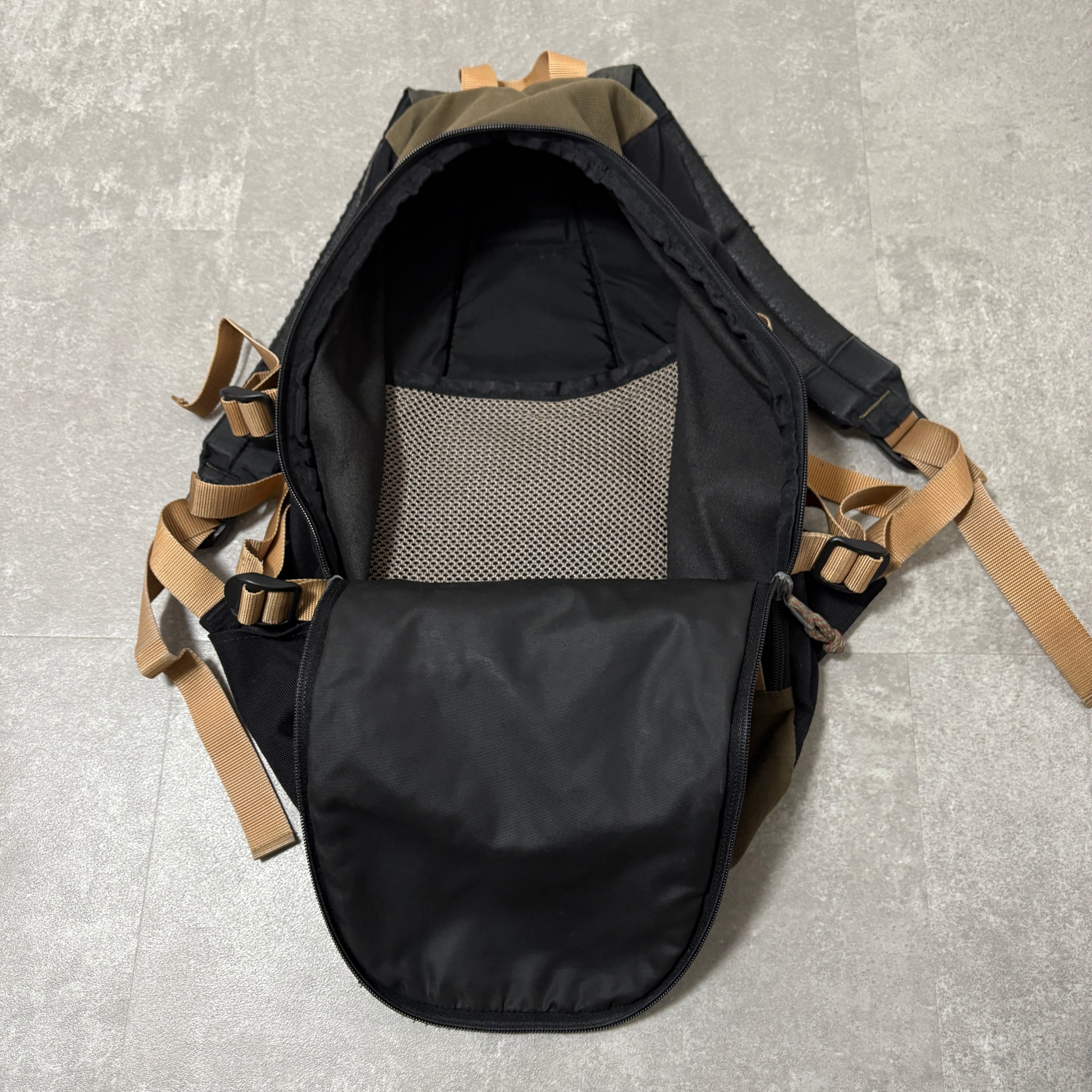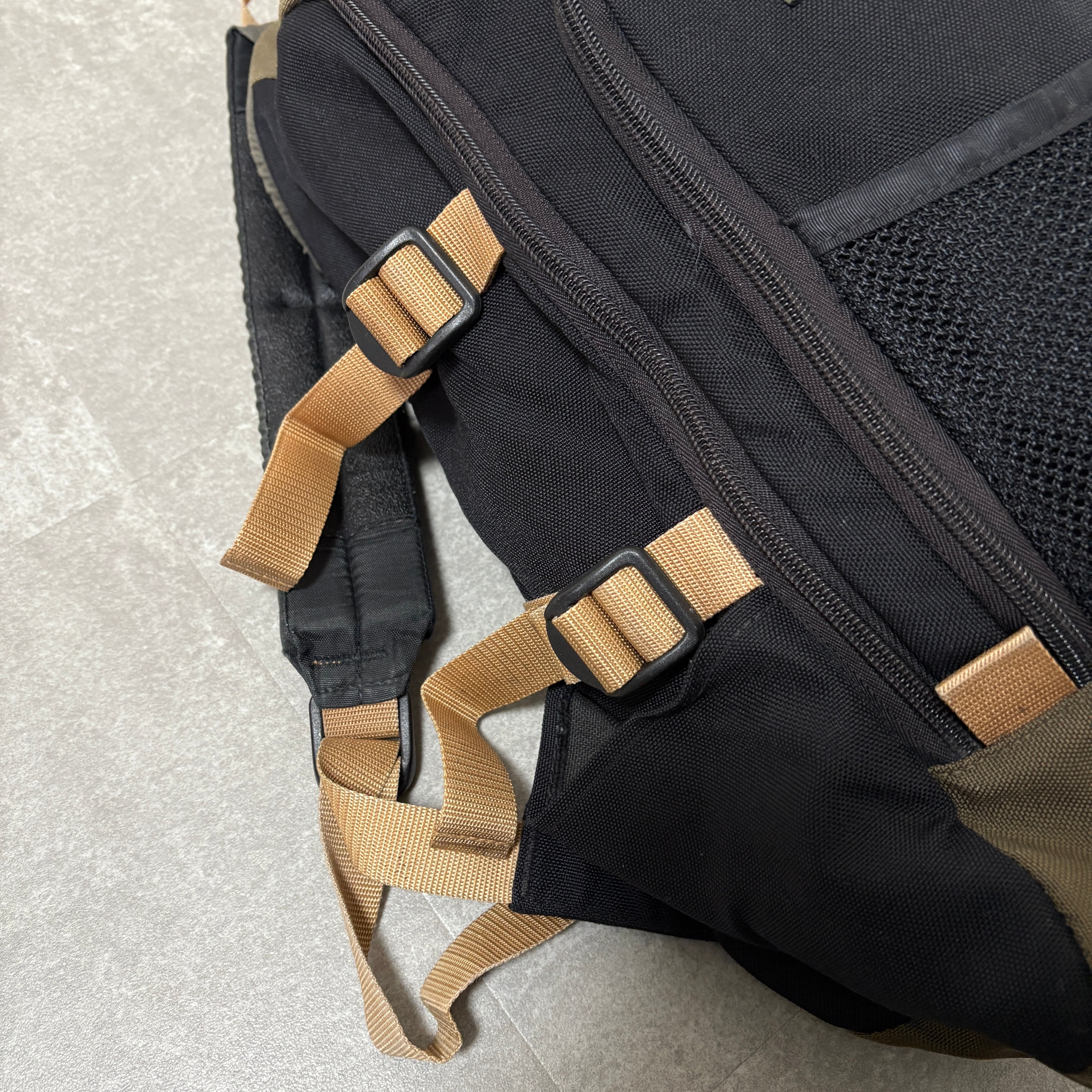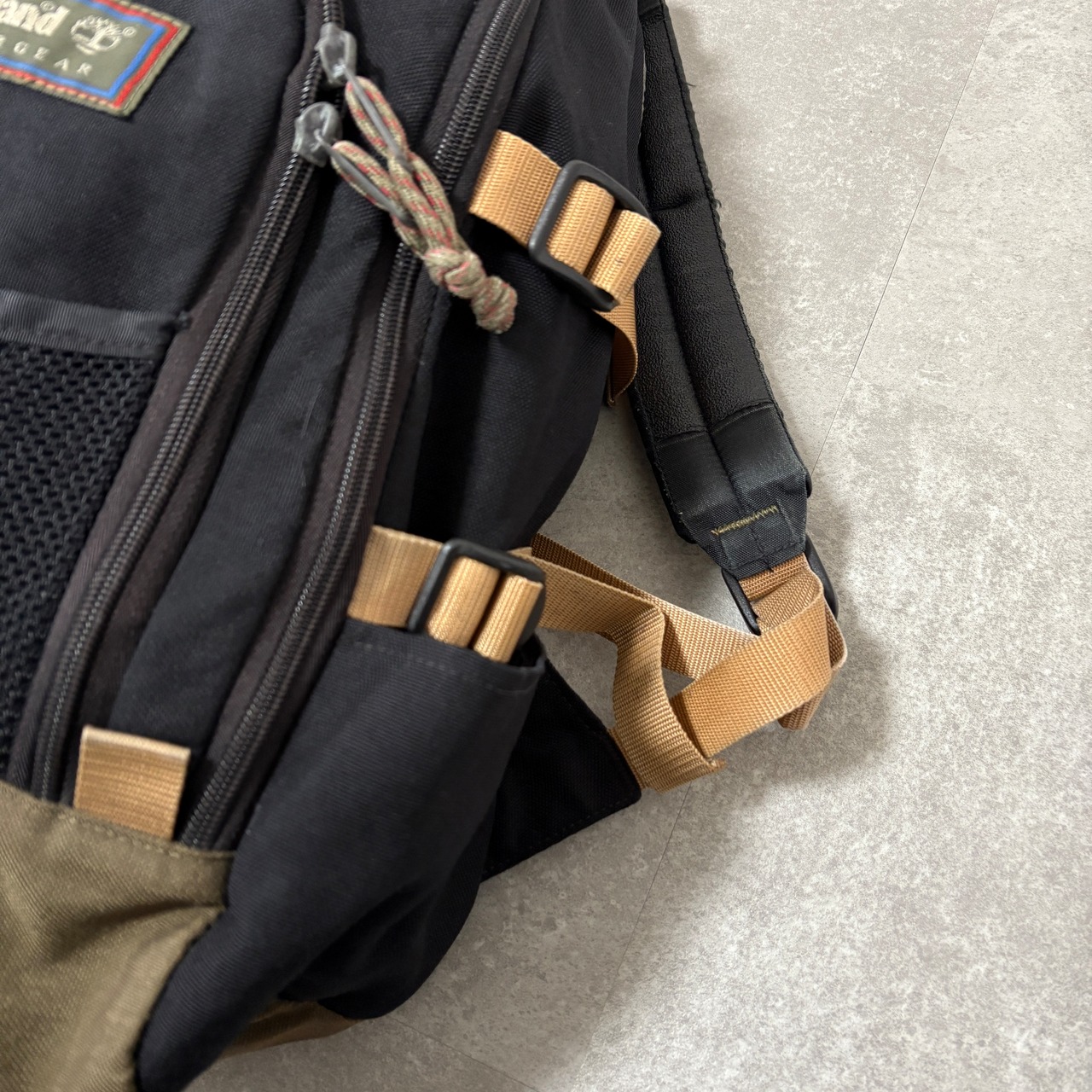 ブラックのボディに、当時のアウトドアギアらしいベージュのウェビングベルト、オリーブの切り替えが映えるグッドカラー