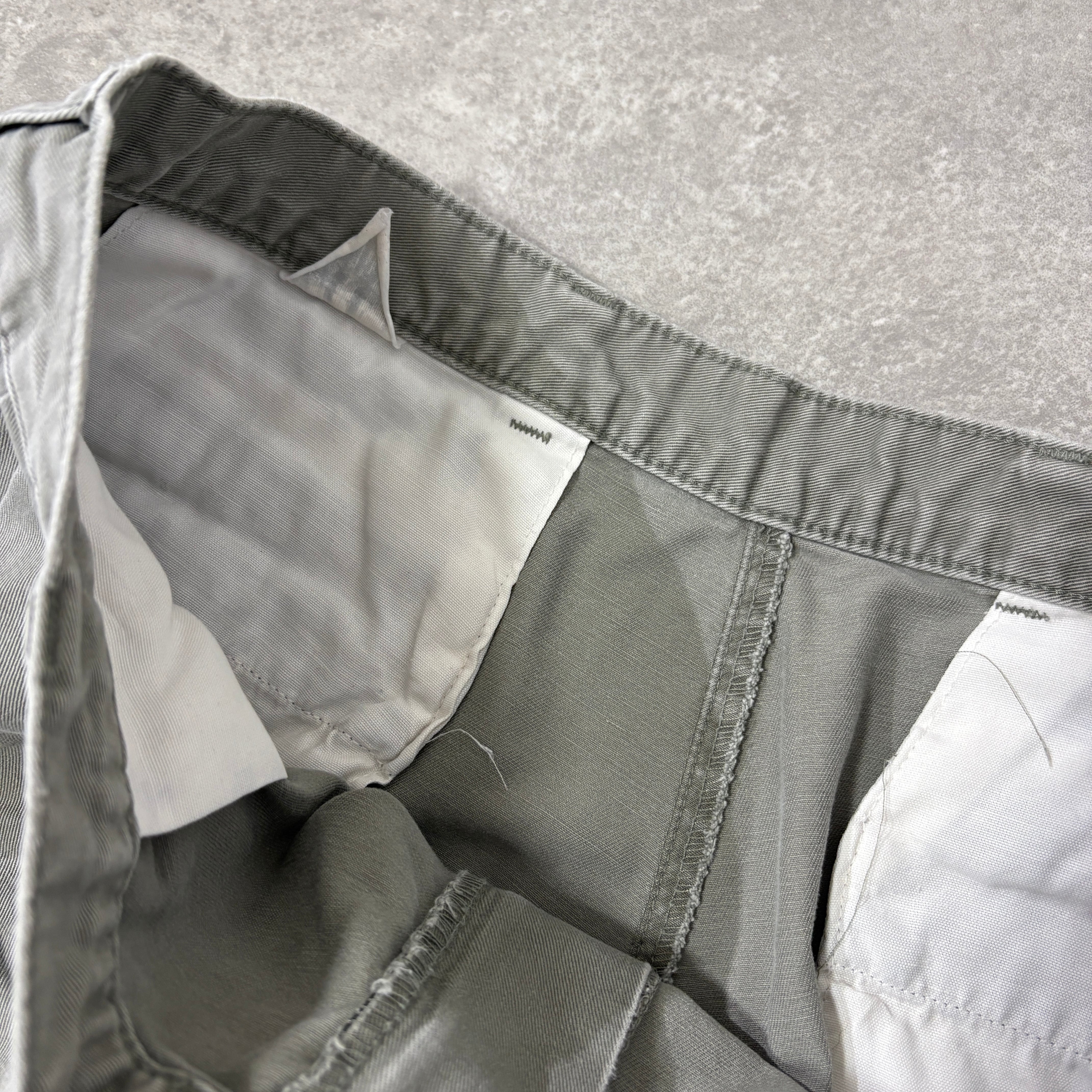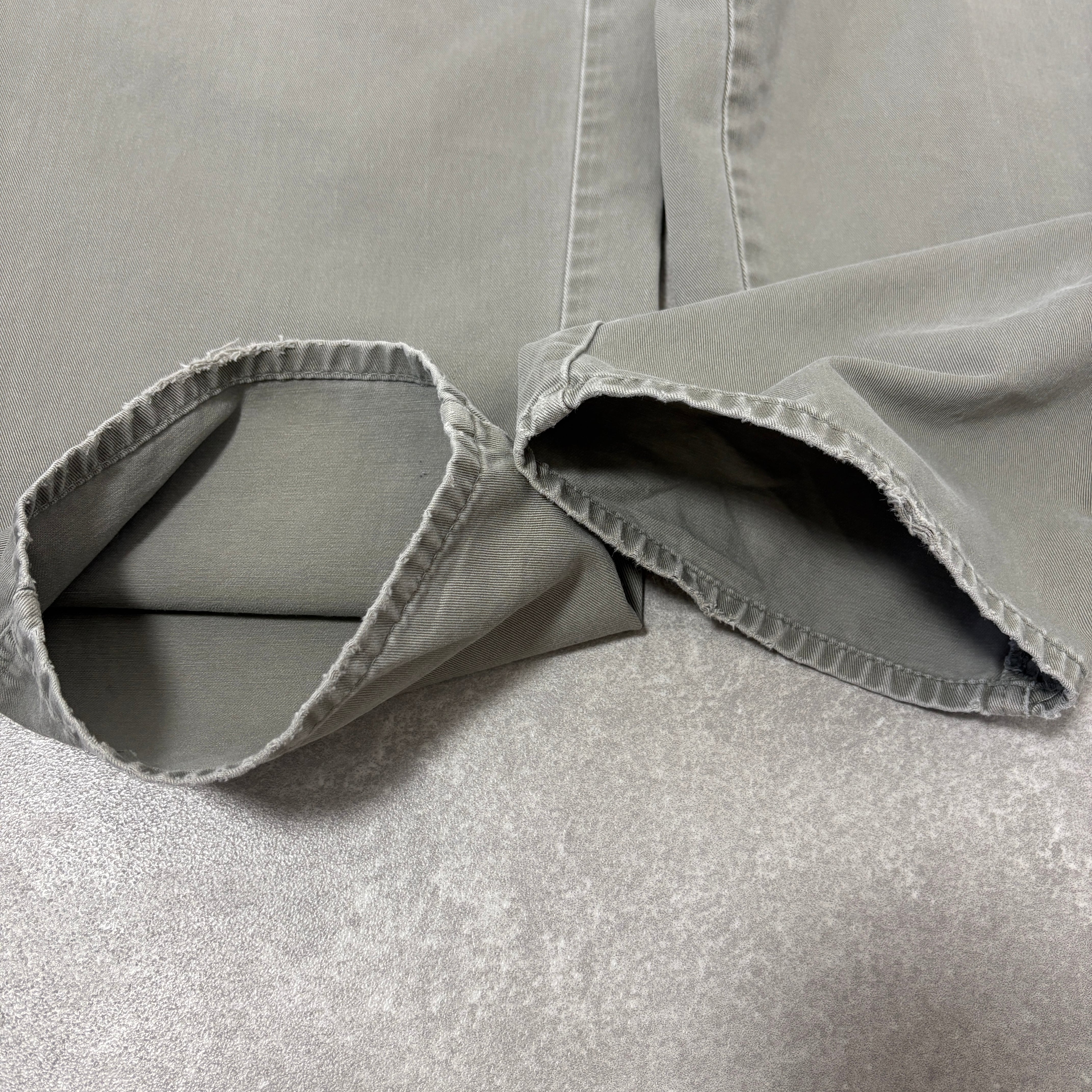 カラーはモスグリーンで、履きこまれしっとりとしたコットン由来の滑らかな質感