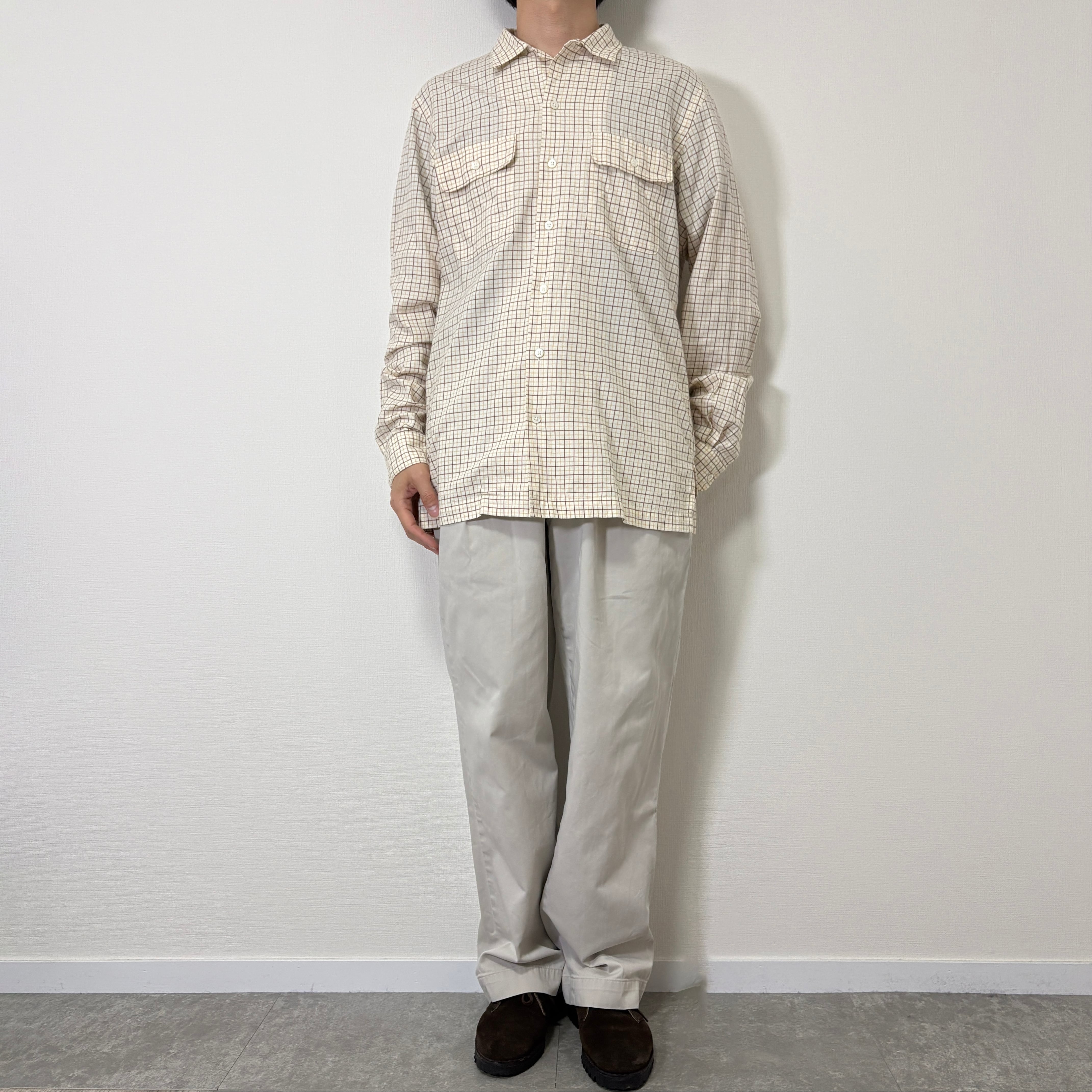 アイボリーまたはクリームカラーに近い色味のボディに濃淡のあるブラウンカラー格子状のラインが入る柄です